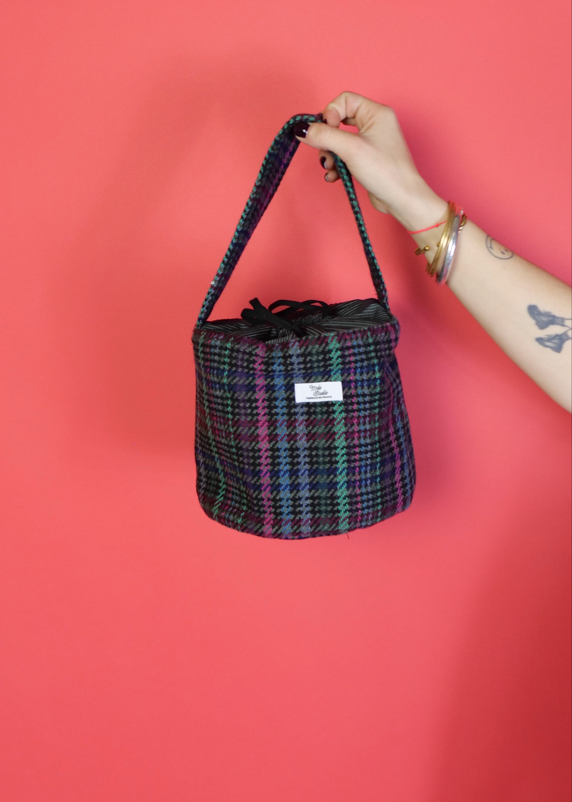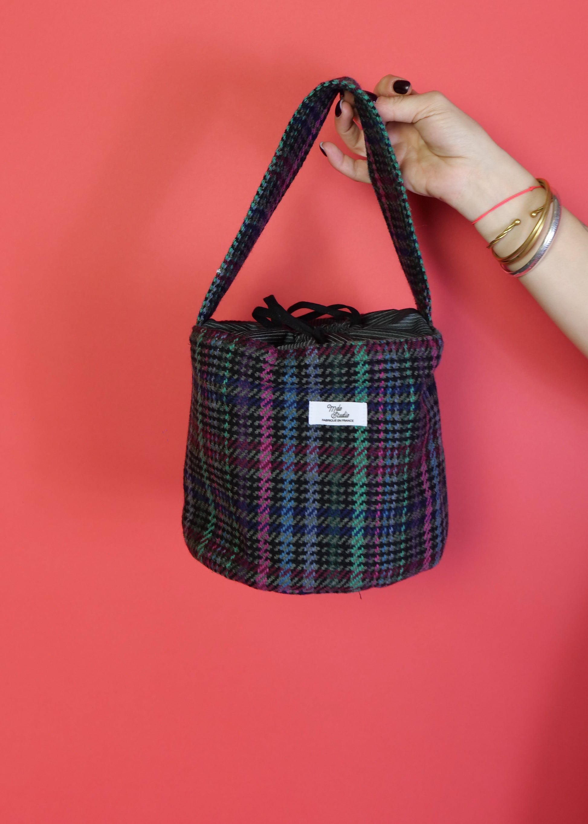Sac seau en lainage fin, anses et cordon de fermeture.